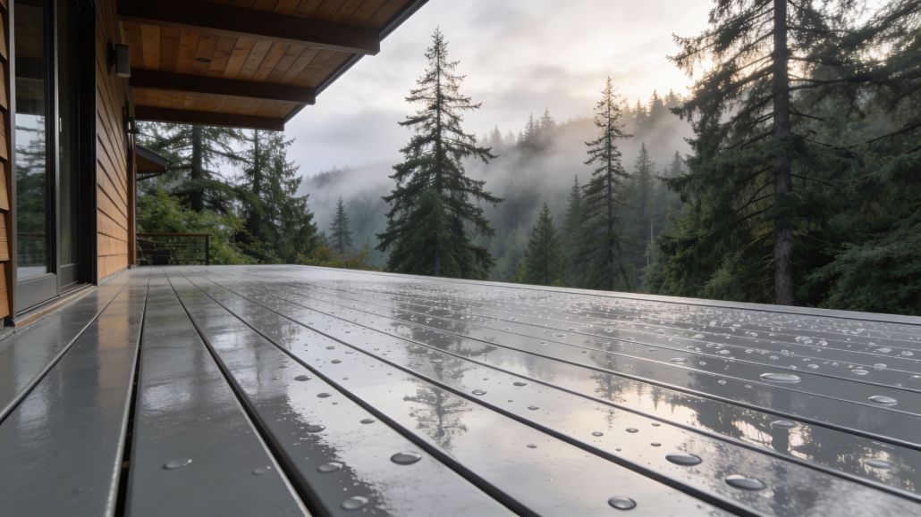 Raindrops resting on a smooth, modern grey composite deck after a light summer rain shower outdoors.